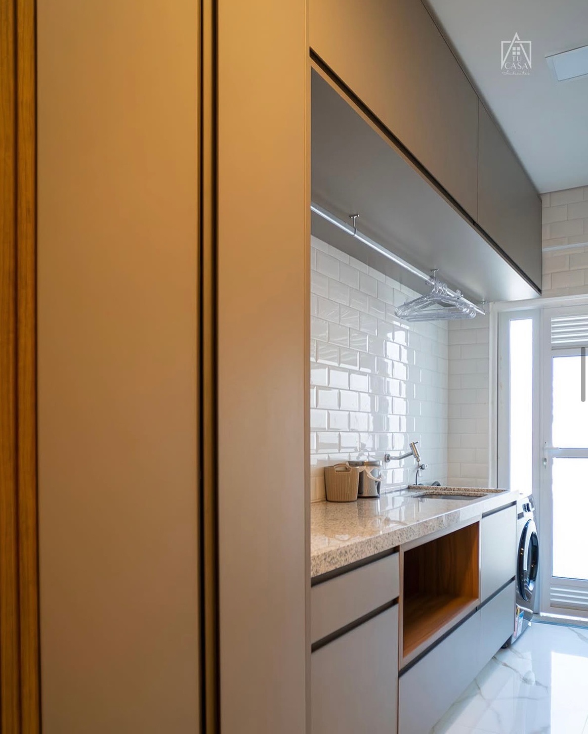 A marcenaria em tom amadeirado traz sofisticação e aconchego ao ambiente. As linhas retas, o nicho amplo e a bancada em pedra criam uma lavanderia funcional, organizada e visualmente elegante.