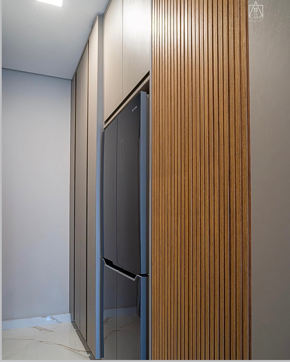 O painel ripado adiciona personalidade ao ambiente enquanto os armários amplos e as máquinas embutidas criam uma lavanderia organizada, elegante e pensada para otimizar a rotina.