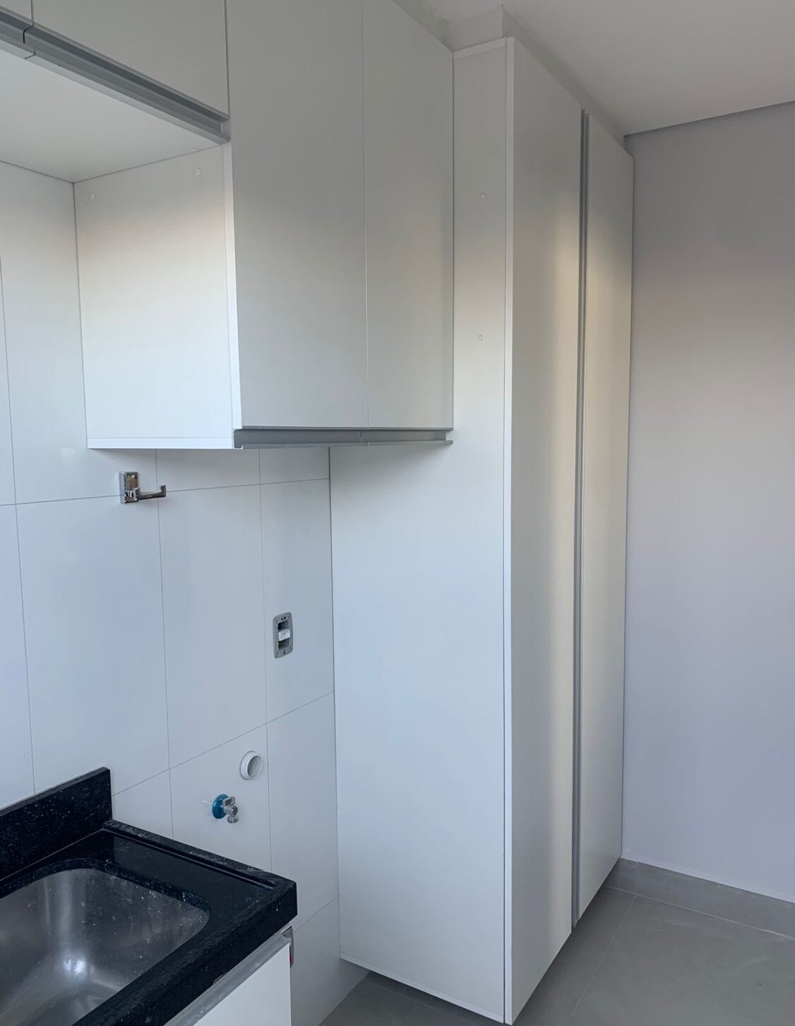 Um projeto simples e funcional para o dia a dia. Os armários brancos trazem leveza ao ambiente e garantem organização, aproveitando o espaço com eficiência.