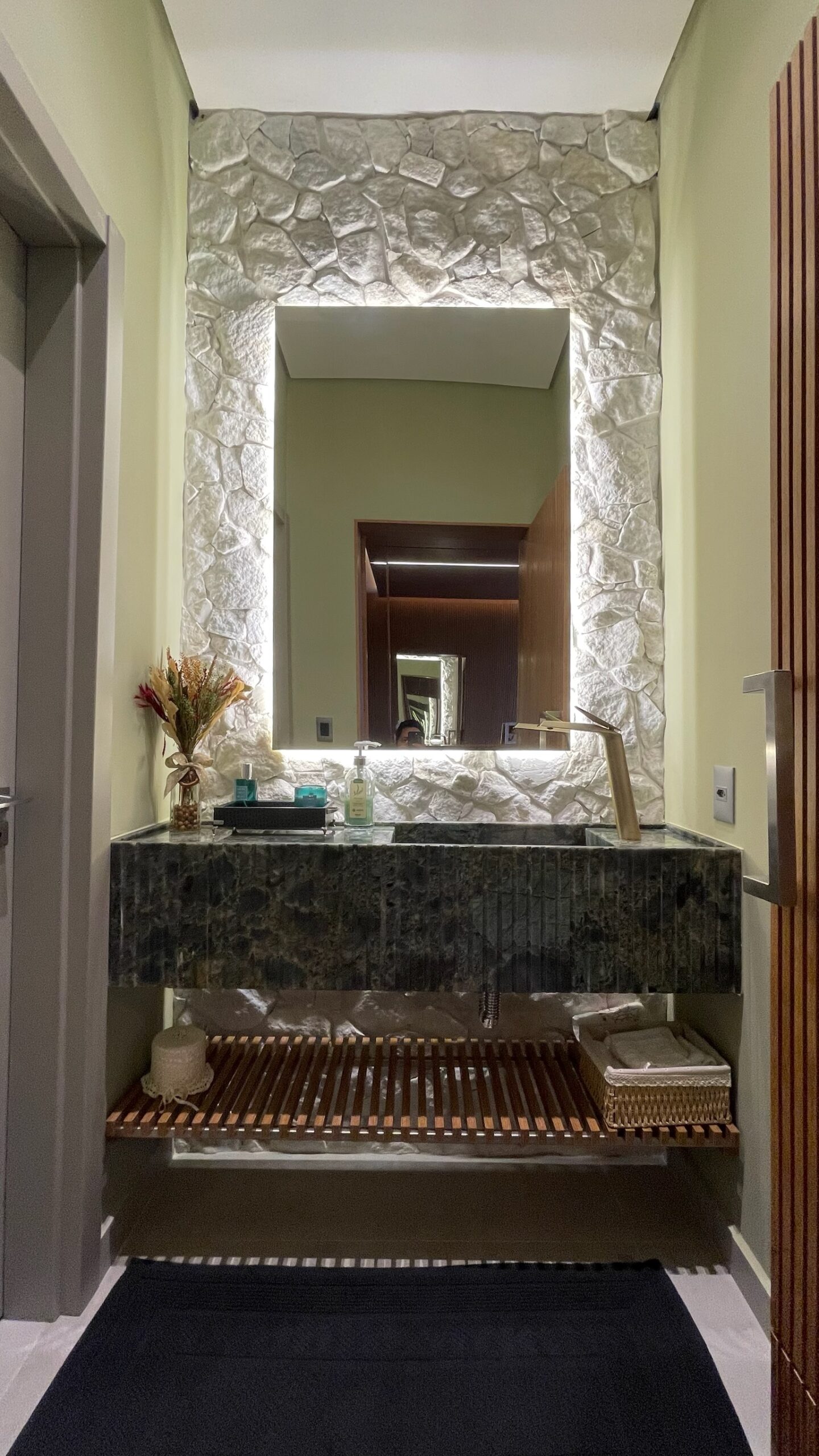 A combinação entre tons escuros, iluminação bem posicionada e materiais marcantes cria um banheiro sofisticado e cheio de personalidade. Um espaço pensado para transformar a rotina em uma experiência mais elegante.