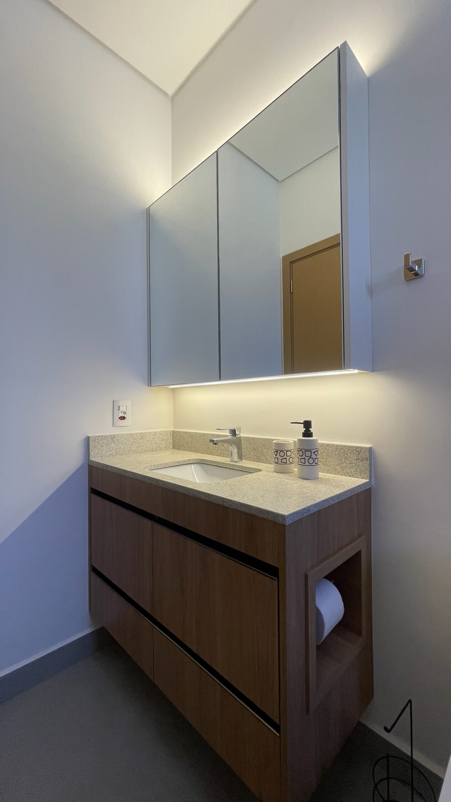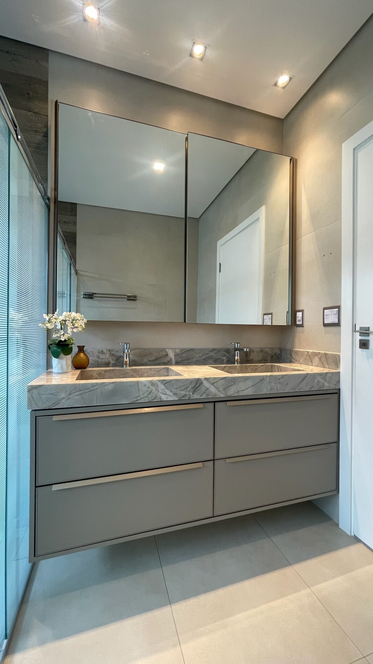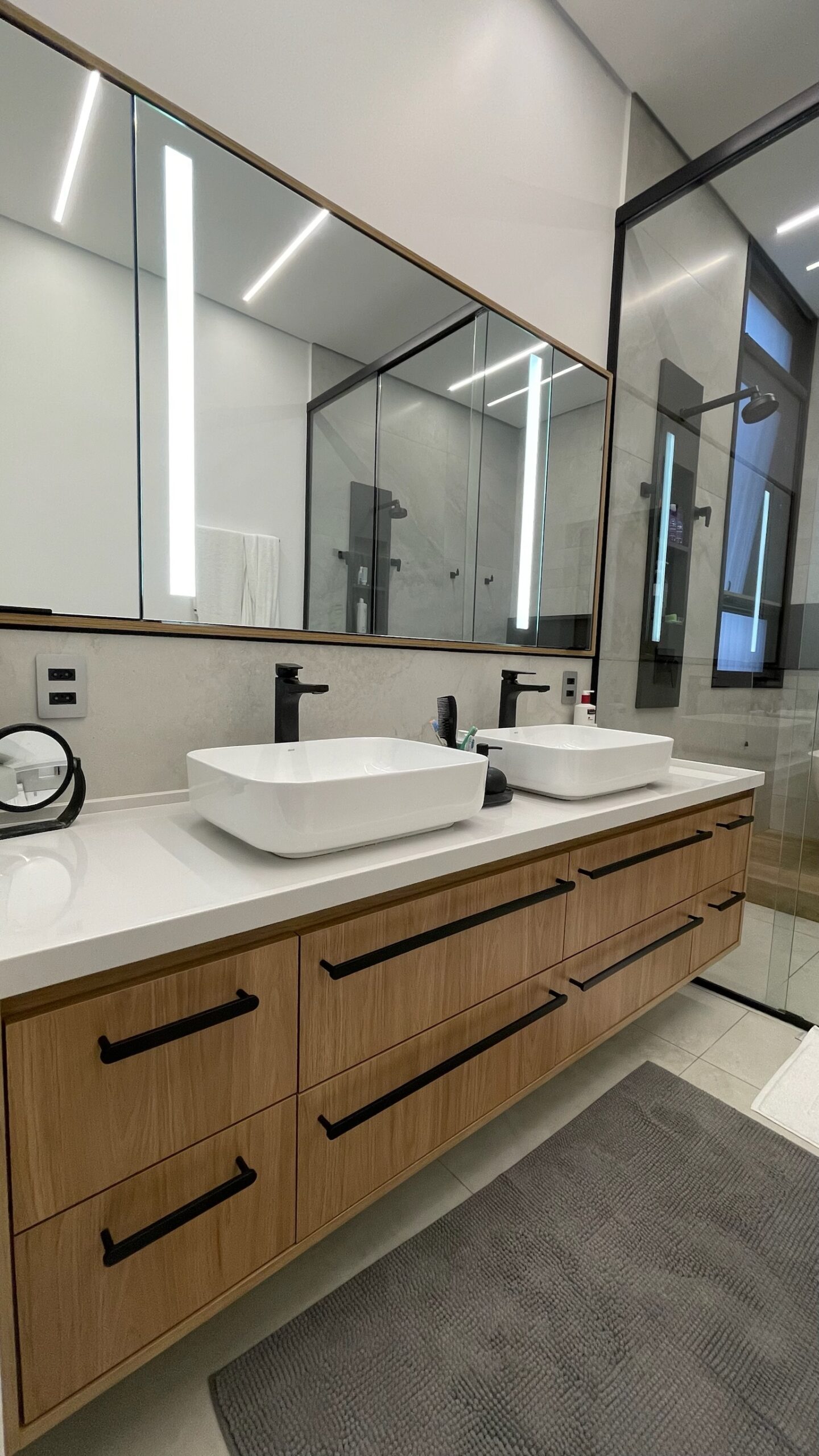 Bancada ampla, espelhos generosos e móveis planejados que valorizam cada detalhe. A integração dos elementos traz funcionalidade e um visual contemporâneo que amplia a sensação de espaço.