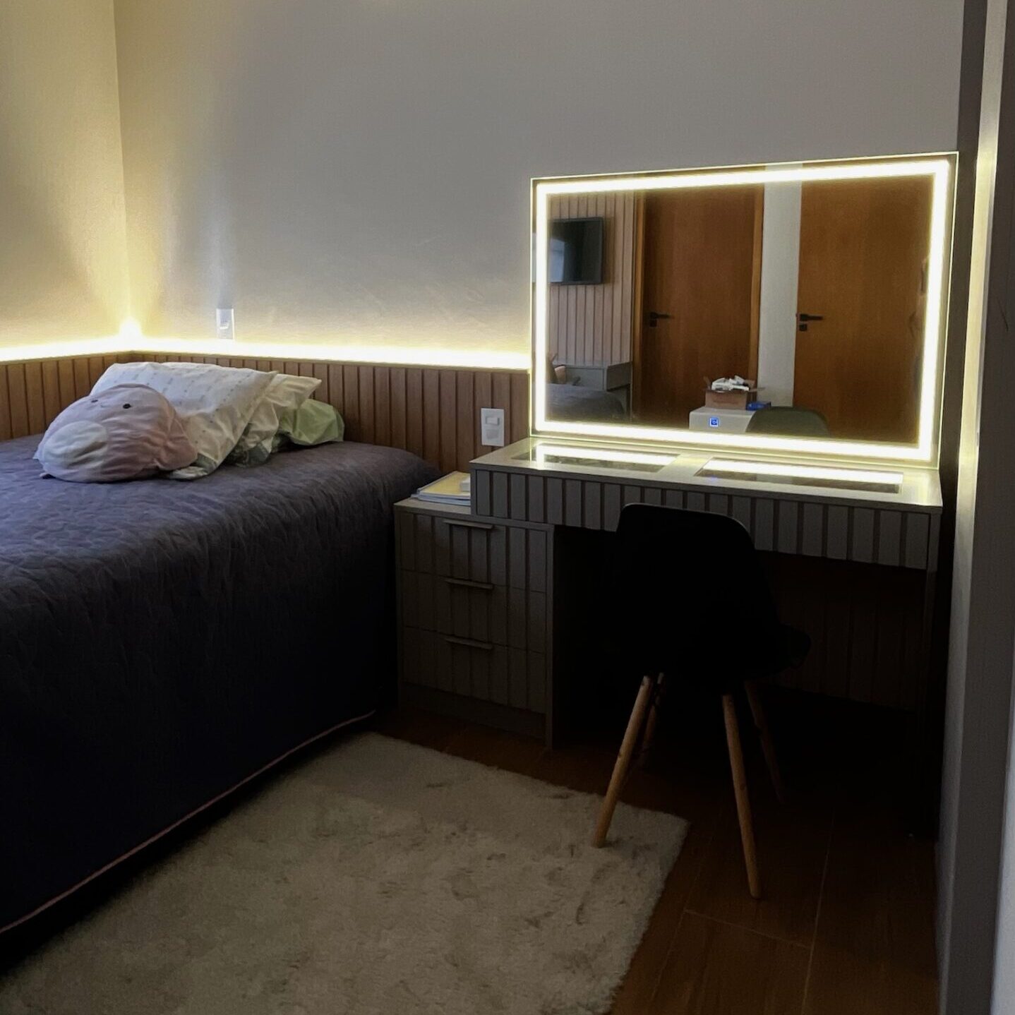 A penteadeira com espelho iluminado se integra ao ambiente com elegância, trazendo funcionalidade ao dia a dia e adicionando um toque de sofisticação à suíte.