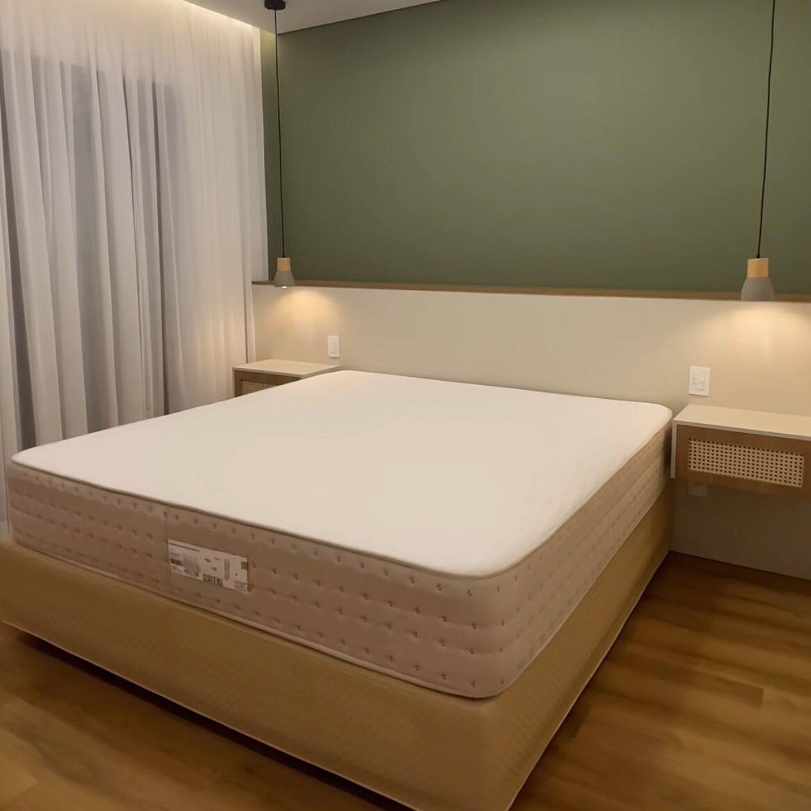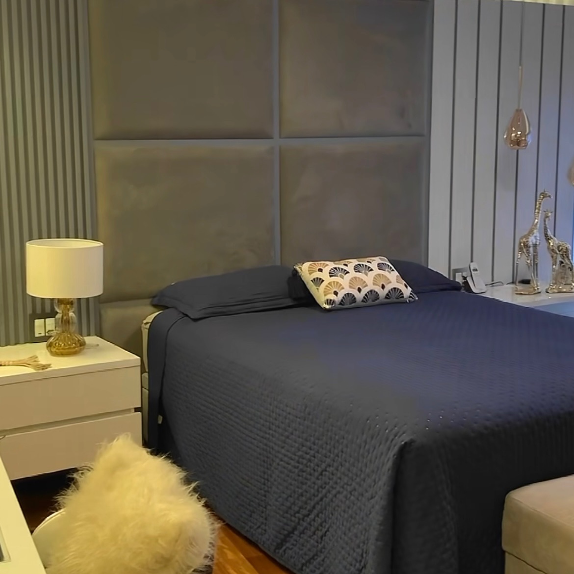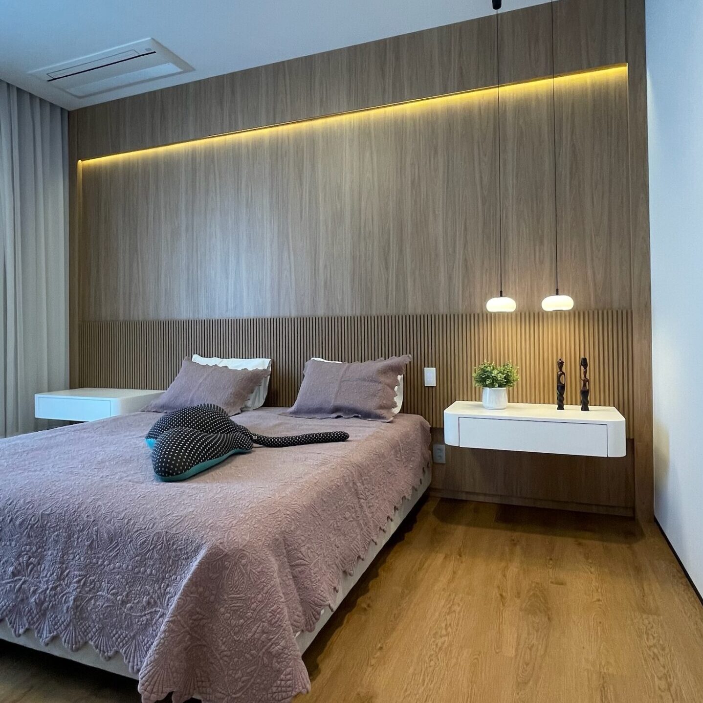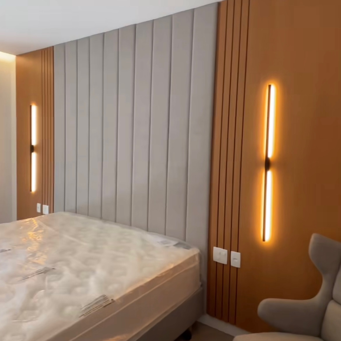 Linhas verticais e iluminação decorativa valorizam o painel da cabeceira, criando um ambiente moderno e equilibrado, onde cada detalhe contribui para uma estética leve e sofisticada.