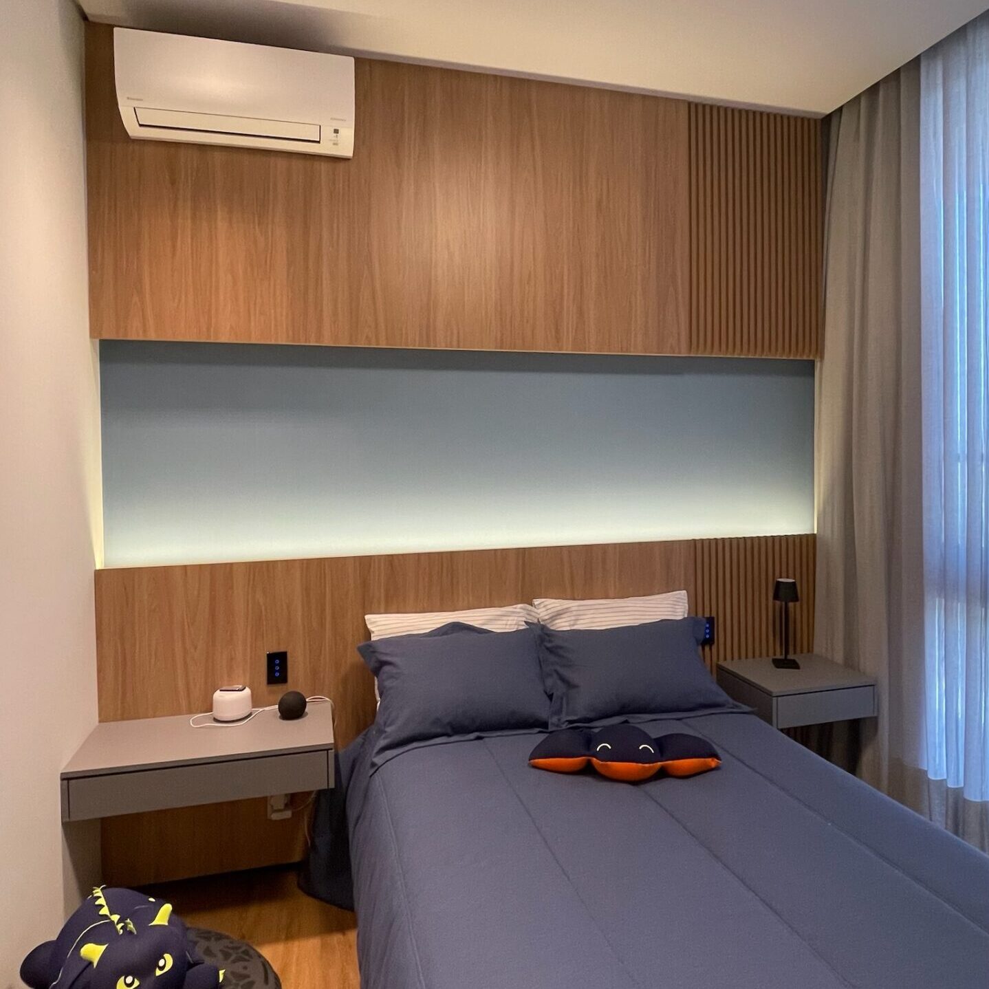 O painel amadeirado em toda a cabeceira cria um ambiente sofisticado e acolhedor. A iluminação em LED valoriza as linhas do projeto e reforça a atmosfera moderna da suíte.